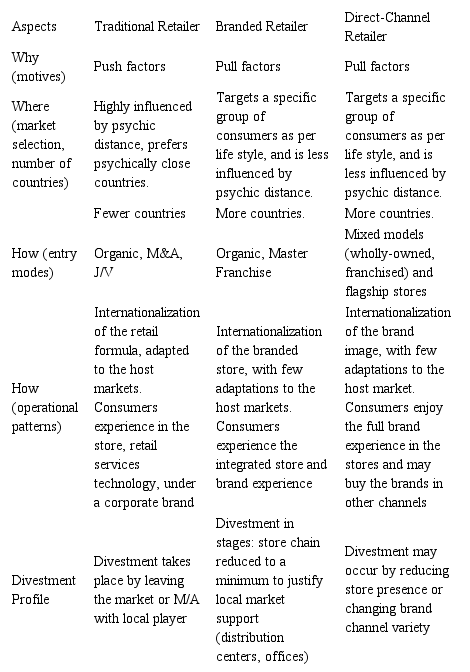 Direct Branded Retailers, manufacturers that also sell through direct retailing, possess features that allow them to internationalize faster and broader: the strength of their brand, the attractiveness of the products/technologies to given consumer segments across several countries, the importance of the direct retail to their main manufacturer business and their standardized formats. Specialized Branded Retailers, retailers that sell exclusively their own brands, count on an internationalized supply chain and brand appeal that sets them apart from fierce price competition and helps them achieve a global position. Traditional Retailers, retailers of multi-branded third parties’ products, on the other hand, lack brand differentiation and face major adaptation issues, which lead them to operate in few and usually psychically close markets. Although their retail formula is easily transferable to host markets, it is also easy to be imitated and may have been preempted by indigenous competitors, making them strategically more vulnerable to host market competition (Dawson, 1994).