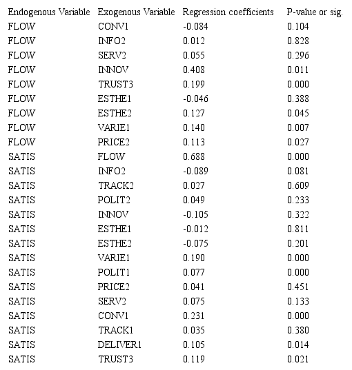 To check the statistical significance of the regression coefficients, we tested the null hypothesis of beta is equal to zero for each of the proposed relationship between endogenous and exogenous variables of the model. At a significance level of 0.05, we rejected the null hypothesis for the proposed relations between the following variables: INNOV and FLOW (b = 0,408), TRUST3 and FLOW (b = 0,199), VARIE1 and FLOW (b = 0,140), ESTHE2 and FLOW (b = 0,127), PRICE2 and FLOW (b = 0,113), FLOW and SATIS (b = 0,688), CONV1 and SATIS (b = 0,231), VARIE1 and SATIS (b = 0,190), TRUST3 and SATIS (b = 0,119), DELIVER1 and SATIS (b = 0,105), and POLIT1 and SATIS (b = 0,077).