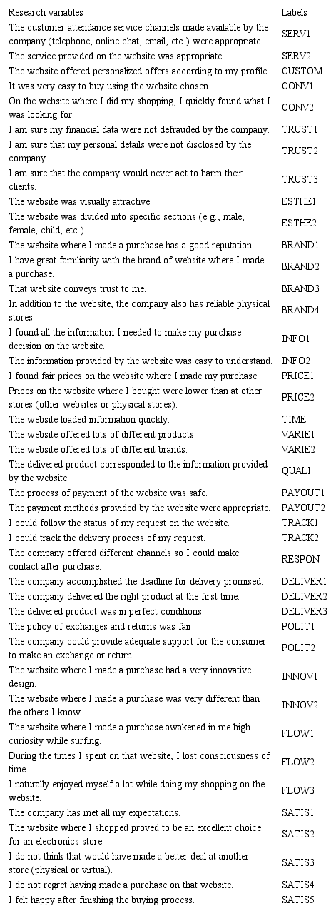 The questionnaire was divided in three parts. First, theoretical constructs identified in the literature review as antecedents of e-satisfaction (attributes that are part of the online shopping experience and influence e-satisfaction) gave rise to a set of one to four questions or statements which were included in the questionnaire, which can be explained by the fact that they are multidimensional and include more than one aspect. Second, the construct "online flow" gave rise to three statements, which also can be explained from its multidimensionality. Finally, the construct "e-satisfaction" gave rise to five statements, considering five complementary theoretical perspectives were identified that can be used to measure it (Ceribeli, 2015).