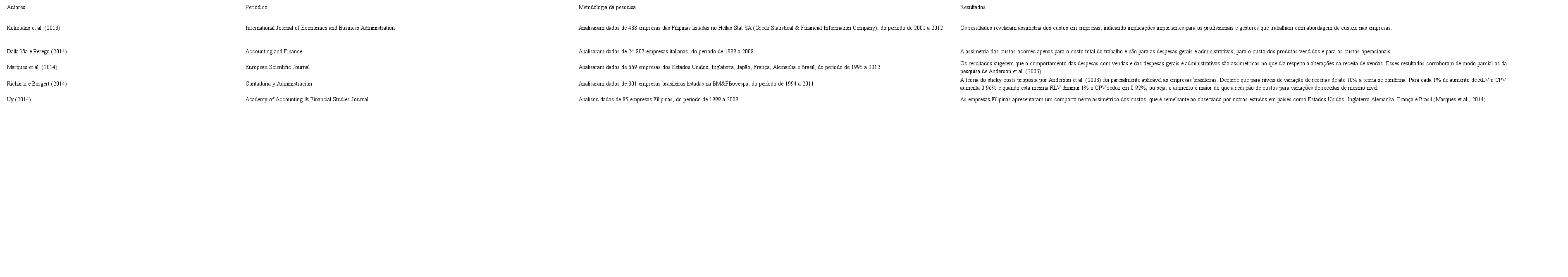 Os estudos apresentados no Quadro 3 corroboram com as inferências de Malik (2012) no que concerne às consequências do comportamento dos custos.