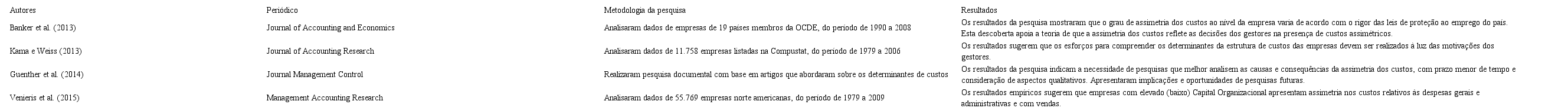 Guenther et al. (2014) fizeram uma releitura do cenário de pesquisas sobre o comportamento dos custos. Os autores indicaram a necessidade de pesquisas que melhor analisem as causas e consequências da assimetria dos custos. O tipo de estudo realizado pelos autores é importante para a evolução de pesquisas na área, assim como se destaca o estudo de Malik (2012). Uma importante contribuição do estudo de Guenther et al. (2014) é a de observar que a assimetria dos custos não é apenas um fenômeno natural, pois apresenta características capazes de serem gerenciadas pelos gestores. Nessa perspectiva, o planejamento dos custos organizacionais pode contribuir para a determinação das variações aceitáveis dos custos em relação às variações na receita.