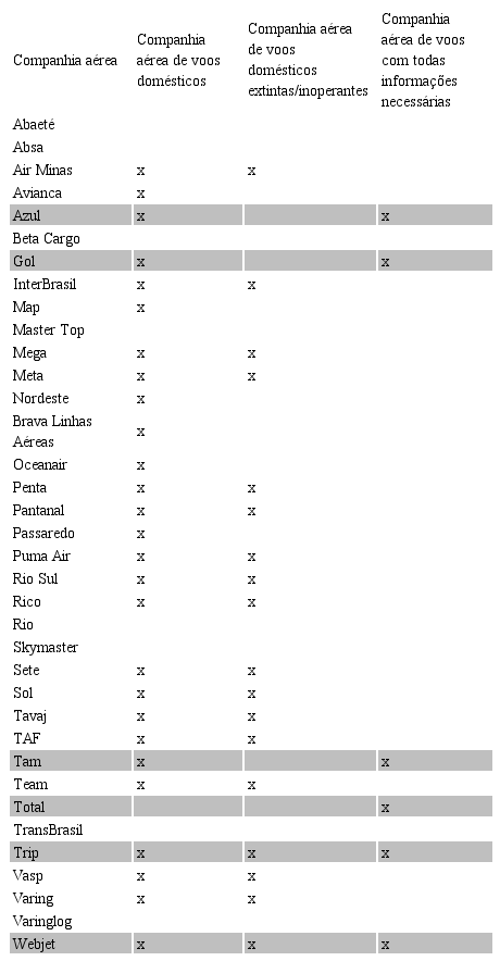 O grupo de companhias aéreas do Quadro 4 compõe-se de empresas de carga (logística), empresas de baixos custos e empresas que ofertam mais de uma classe em um único voo, o que se difere de companhias de baixo custo que ofertam apenas uma classe. A amostra foi composta pelas empresas que prioritariamente apresentaram todas as informações requeridas para a realização da pesquisa, dessa forma, compreendem a amostra da pesquisa as seguintes empresas: Azul Linhas Aéreas Brasileiras, Gol Linhas Aéreas Inteligentes, Tam Linhas Aéreas, Total Linhas Aéreas, Trip Linhas Aéreas, Webjet Linhas Aéreas.