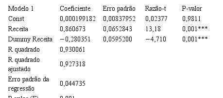 Observa-se que o custo é explicado pela função: Custo = 0,0001 + 0,86Receita - 0,28Dummy * log ( . Em que o valor estimado