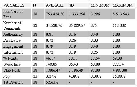 The analysis of Table 3 allows us to understand the behaviour of the variables in the sample studied. Although this study intended to work with the 40 clubs of 1st Division and 2nd Division of Brazilian Championship, as explained earlier, we chose to work with a sample of N=38. In the independent variables, we found 1,806 insertions as the average postings of the clubs. The minimum posted by a club was 97 and the maximum 4,981. The average points was 46.2%, being the best utilization 69.3% and 17.5% the worst. The average period that clubs are on Facebook are 148 weeks, which indicates that it has been a while since they have their profile, but not necessarily see on the platform a channel for the communication with their fans.