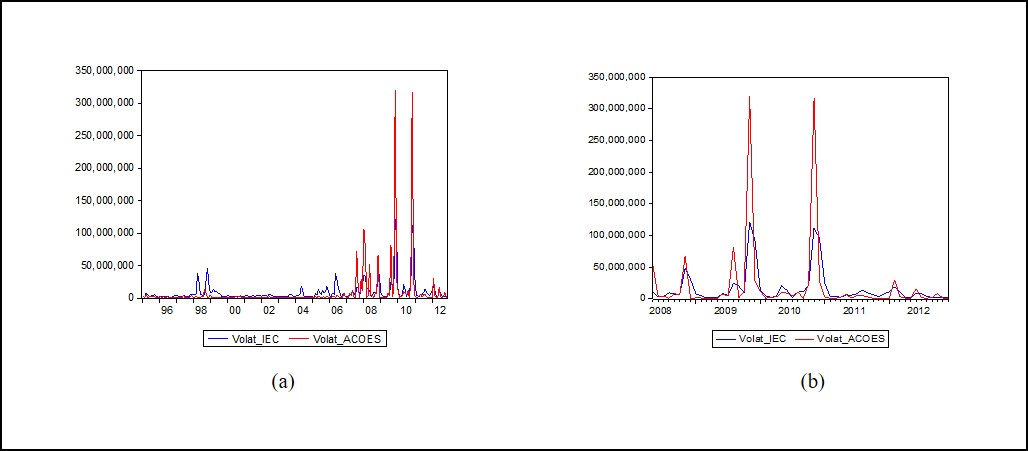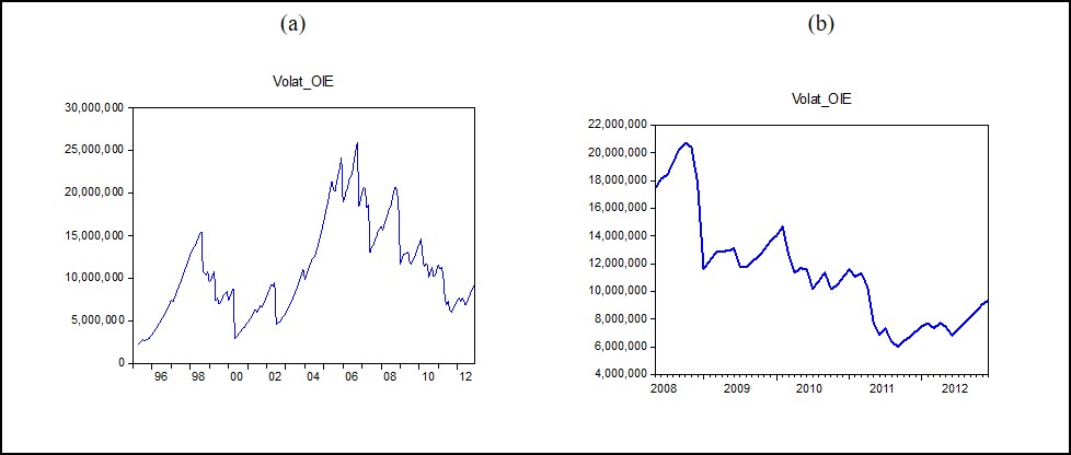 Não foi possível utilizar as variáveis (volatilidade das contas financeiras) em log por haver valores negativos. O gráfico da Figura 1 mostra que o Investimento Externo em Carteira tem apresentado mais volatilidade que os demais investimentos. O Investimento Externo Direto apesar de ser considerado mais de longo prazo e portando menos volátil também apresentou alguns picos de volatilidade, principalmente em períodos de crise. Além disso, nota-se que o período pós 2004 foi mais turbulento que o período anterior, principalmente devido a crises mais sérias como, por exemplo, a crise subprime em 2008. Para uma melhor observação destes picos de volatilidade, a Figura 3 apresenta o gráfico de volatilidade do período de crise.