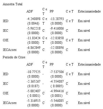 Os resultados dos testes de raiz unitária para as séries IED, IEC, OIE e Ações apresentados na Tabela 1, revelam que todas as variáveis são estacionárias em nível, ou seja, são I(0) tanto para os testes ADF quanto para os testes de PP.