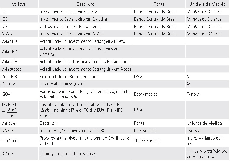 Os dados utilizados para análise empírica referem-se à série de tempo de quatro contas financeiras liquidas do Balanço de pagamentos do Brasil, a saber: (i) investimento estrangeiro direto; (ii) investimento estrangeiro em carteira; (iii) derivativos; (iv) outros investimentos estrangeiros. A frequência de dados é mensal e o período vai de janeiro de 1995 a dezembro de 2010. A fonte de dados é o Banco Central do Brasil. O final da amostra foi limitado a dezembro de 2010 em função da variável ICRG (proxy para qualidade institucional no Brasil)
