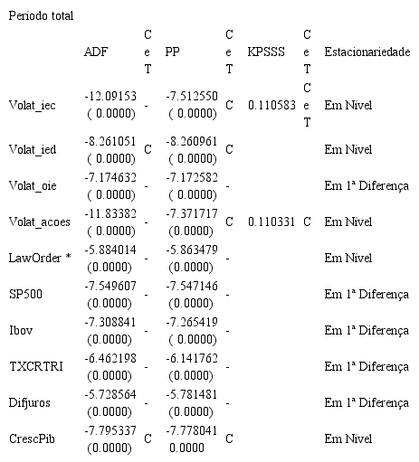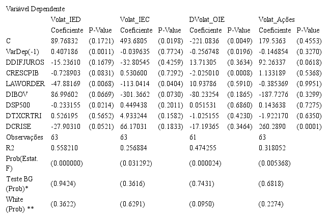 Para investigar quais são os determinantes da volatilidade do Investimento Estrangeiro em ações, foram feitas regressões com série de tempo. O modelo utilizado baseou-se no modelo desenvolvido por Broto, Cassou e Domingues (2008). A volatilidade mensal foi transformada em trimestral e foi regredida sobre variáveis explicativas domésticas e externas. Foram feitos testes de auto correlação e heteroscedasticidade. Os resultados dos testes de estacionariedade das variáveis explicativas e das variâncias condicionais são apresentados na Tabela 2 e os resultados das regressões são apresentados na Tabela 3.
