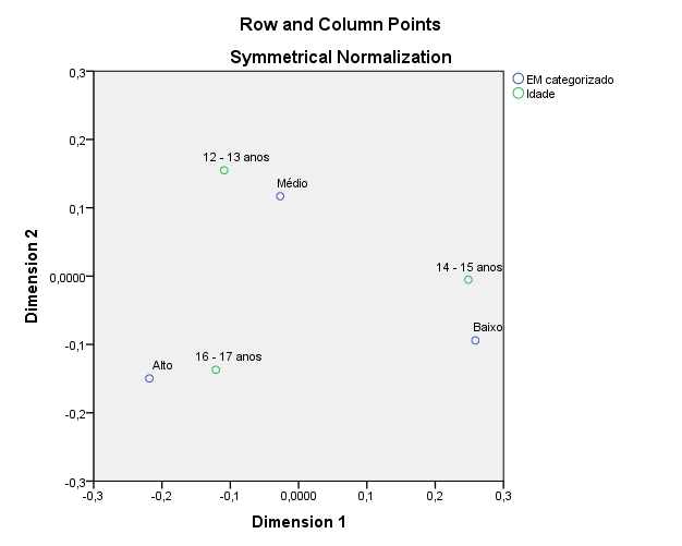 Pode-se observar na Figura 2 que as faixas etárias 12 a 13 anos estão mais associadas ao nível médio de materialismo, a faixa de 14 a 15 anos ao nível baixo e a faixa de 16 a 17 anos ao nível alto. Confirma-se, de forma descritiva, o resultado encontrado na Tabela 1.