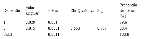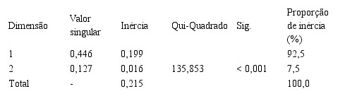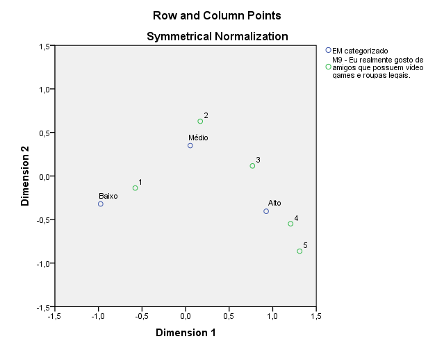 Diante do exposto na Tabela 3, pode-se observar que a dimensão 1 explica 92,5% da variabilidade total (inércia total) contida na tabela bidimensional. Na Figura 3 foi apresentada a ilustração da distância entre as linhas e colunas da tabela entre a variável M9 e os escores de materialismo categorizados em baixo, médio e baixo.