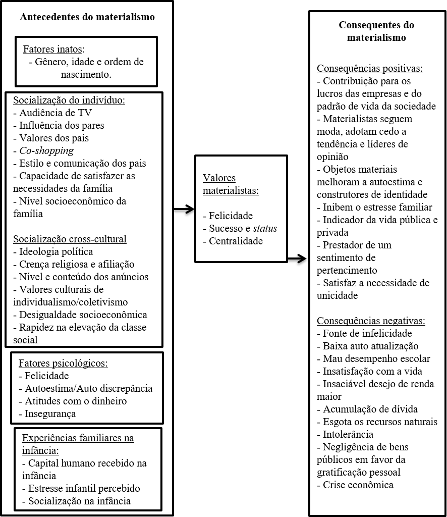 A fim de melhor visualizar o delineamento da pesquisa, este trabalho se baseou em uma estrutura teórica integrada dos diversos antecedentes do materialismo, bem como das consequências, sejam negativas ou positivas desta característica de consumo. Esse modelo teórico foi construído por Duh (2015) a partir da literatura acadêmica, estudos empíricos, relatórios, fatores biológicos, sociais, culturais, socioeconômicos, psicológicos e até mesmo políticos do materialismo.