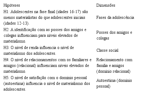 Chaplin e John (2007) ressaltam que os agentes de socialização como o grupo de pares, da mídia e a família, muitas vezes pensadas para afetar o desenvolvimento de valores materialistas em jovens darão a sua influência indiretamente por meio de seu impacto na autoestima. Diante do exposto sobre os níveis de materialismo em diferentes fases da adolescência, foi elaborada a seguinte hipótese: