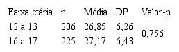 Ao se tratar da idade, esta foi dividida de acordo com as fases da adolescência descritas por Chaplin e John (2007) e apresentadas a seguir. Os termos originais são: early adolescence (12-13 anos); middle adolescence (14-15 anos) e strong age (16-18 anos incompleto). Os percentuais foram 32,8%, 31,8% e 35,4% respectivamente, observam-se bem equilibradas a distribuição das faixas etárias.