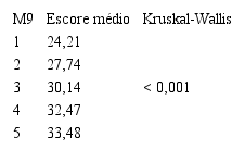 Pode-se observar na Figura 3 que o valor 1 de M9 está associado ao nível baixo de materialismo, o nível 2 associado ao nível médio dos escores de materialismo e os valores 3, 4 e 5 estão associados ao nível alto do materialismo. Confirma-se, de forma descritiva, a evidência de que quanto menor a identificação com as posses dos pares, menor é o nível de materialismo, e quanto maior a identificação com as posses dos pares (nível 3, 4 e 5), mais alto é o nível de materialismo dos adolescentes. Na Tabela 4 são apresentados mais dados que evidenciam esta afirmação.