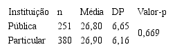 A Tabela 1 mostra médias muito semelhantes entre estes dois grupos. O teste de Kolmogorov-Smirnov (valor-p < 0,001) mostra que estes escores não seguem uma distribuição normal. Portanto, a comparação destes escores deve ser realizada pelo teste não paramétrico de Mann-Whitney, cujo resultado comparativo mostra (valor-p = 0,756) que os dois grupos das faixas etárias não apresentam diferenças estatísticas significantes. Cabe ressaltar que o teste de Mann-Whitney é aplicado na comparação de duas amostras independentes que, para caracterizar significância o valor-p, deve ser menor que 0,05.