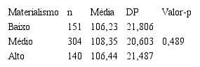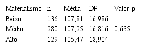 Esta influência não foi identificada de acordo com os resultados obtidos com a amostra, talvez pelo fato de que não foi detectado um alto nível de materialismo entre os respondentes e com isso ficou difícil estabelecer relação com os antecedentes, pois segundo os autores, a relação existe quando são identificados níveis elevados de materialismo.