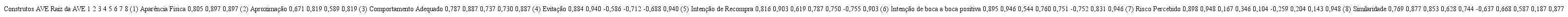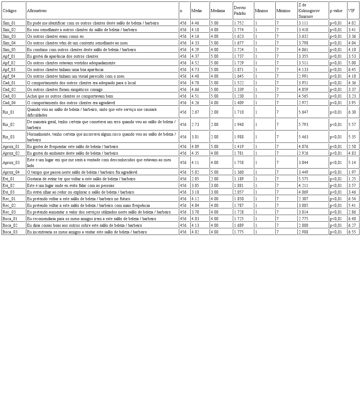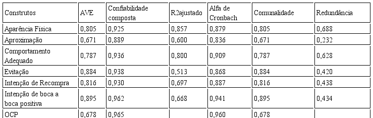 Observamos que a carga da variável Evi_01 (Gostaria de evitar ter que voltar a este salão de beleza/barbeiro) apresentava carga fatorial com o construto de primeira ordem (Evitação) inferior ao limite crítico (l< 0,50), portanto a mesma foi eliminada. Do mesmo modo, verificamos que o construto aparência física apresentou índice de redundância muito elevado (>0,7). Por conta disso, eliminamos a variável Apf_03 (Os outros clientes tinham uma boa aparência) que apresentava alta correlação com os demais itens de mensuração do construto. Após os ajustes, em uma segunda tentativa, observamos que a validade convergente estava dentro dos parâmetros estabelecidos pela literatura.