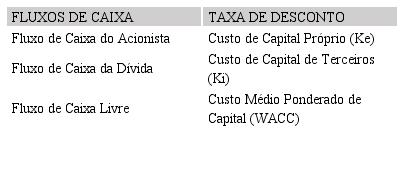 Fernández (2002) apresenta três tipos de fluxos de caixa com as respectivas taxas de desconto utilizadas, conforme apresentado no Quadro 1.