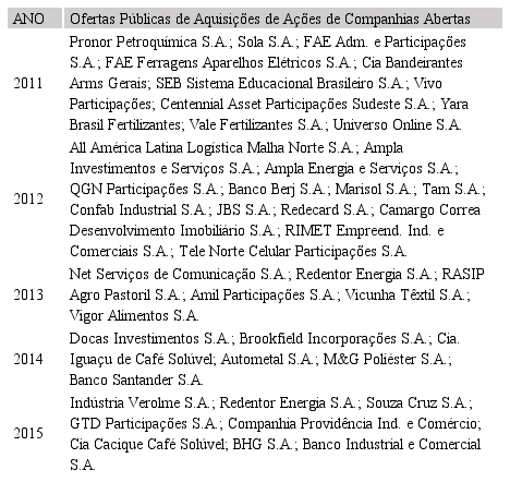 Inicialmente, foram analisados os Laudos de Avaliação das Ofertas Públicas de Aquisições de Ações, registradas no sítio da CVM, referentes ao período de 2011 a 2015, conforme apresentado no Quadro 2.