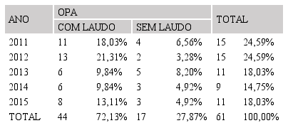 Diante disso, observou-se que no período de 2011 a 2015 foram registradas 61 OPA’s junto à CVM, das quais 44 possuem laudo de avaliação e 17 não, representando 72,13% e 27,87% respectivamente, conforme apresenta o Quadro 4.
