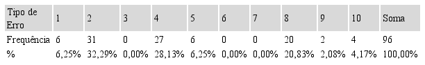 Em virtude de os erros do tipo 3, 6 e 7 não serem identificados nos laudos, e os erros 2 e 9 apresentarem pequena variabilidade quanto a sua ocorrência/não ocorrência, procedeu-se à sua retirada da análise.