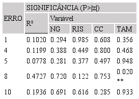 Quanto aos erros 1, 4, 5, 8 e 10, a análise das variáveis Nível de Governança (NG), Risco (RIS), Custo de Capital (CC) e Tamanho (TAM) está demonstrada na Tabela 1.