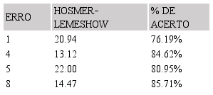 Para confirmar a qualidade dos testes propostos, foi utilizado o teste de qualidade dos ajustamentos de Hosmer–Lemeshow e o teste de percentual de acerto de classificação certa, conforme Tabela 2.