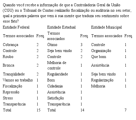 O quadro 2 descreve em termos o “pensamento repentino” dos respondentes quando da chegada dos órgãos do controle externo para fiscalização ou auditoria no setor. Aqui, para o caso da entidade Federal, evidenciou-se que dos 15 respondentes apenas 1 não demonstrou medo ou inquietude, entretanto, os demais se mostraram com atitudes de preocupação. No caso da entidade Estadual há a prevalência de “termos” de tranquilidade, normalidade, podendo aqui, enfatizar que auditoria ou fiscalização são procedimentos normais e necessários aos órgãos públicos, assim como é perceptível nos 7 respondentes da entidade Municipal.