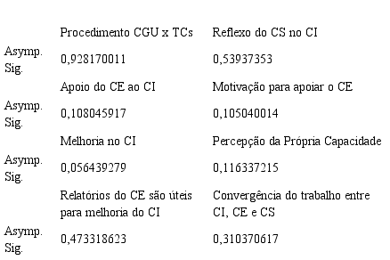 O Gráfico 8, trabalho convergente entre CI, CE e CS, sugere uma presença maior de visões discordantes de que haja realmente convergência entre as atuações do controle interno (CI), controle externo (CE) e controle social (CS). O teste de hipótese, indicado no Quadro 3, para a questão “Convergência do trabalho entre CI, CE e CS”, sugere que a hipótese de nulidade não poderá ser rejeitada, traduzindo não haver divergência relevante entre os três grupos sobre esta questão.