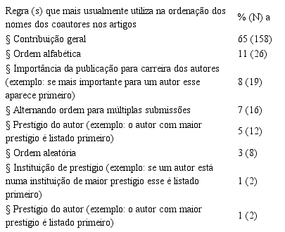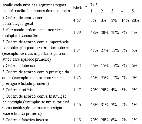 Solicitamos aos participantes para avaliarem um conjunto de práticas de ordenação dos coautores (Tabela 8). 79% dos participantes concordam totalmente que o principal fator de ordenação deve ser a contribuição. Assim, discordam de outros critérios como seguir uma ordem alfabética, ordem aleatória, ordem de importância da publicação para a carreira, etc. Em suma, qualquer critério para além da contribuição é menos legitimado na ordenação dos coautores.