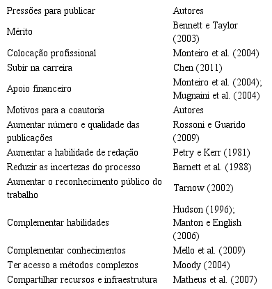 A complementaridade de competências e recursos é um dos principais motores das coautorias. As coautorias permitem a divisão do trabalho entre pesquisadores, juntam habilidades distintas, combinam abordagens teóricas e disciplinares (Hudson, 1996; Manton e English, 2006) e complementam conhecimentos (Mello et al., 2009). A divisão do trabalho é particularmente relevante dado o contexto de maior tecnicidade e especialização das disciplinas e de crescente incorporação de conteúdo quantitativo que requer a aplicação de métodos estatísticos mais sofisticados e complexos (Moody, 2004). Holder, Langrehr e Schroeder (2000) argumentaram que na gênese da motivação para as coautorias está a melhoria da qualidade dos artigos. Matheus et al. (2007), face aos altos custos de pesquisa e desenvolvimento, afirmam que as coautorias permitem compartilhar recursos e infraestrutura. A interdisciplinaridade da ciência que demanda pesquisadores de diferentes áreas de conhecimento (Matheus et al., 2007). As coautorias podem ser interinstitucionais e internacionais porque as tecnologias de informação e comunicação facilitam o trabalho colaborativo à distância (Laband e Tollison, 2000). As principais pressões para publicação e as principais motivações para as coautorias presentes na literatura estão na Tabela 1: