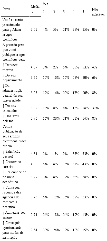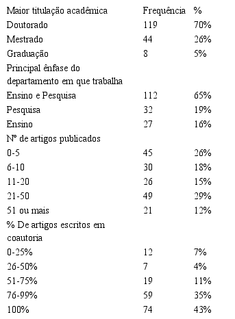 Quanto a produção científica da amostra, 41% dos participantes publicaram mais de 21 artigos científicos, 44% menos de 10 artigos, enquanto 26% publicaram cinco ou menos. Também é relevante que 43% dos respondentes declararam ter escrito todos os seus artigos em coautoria e 78% publicaram mais de 75% dos seus artigos em coautoria.