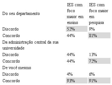 As diferenças são, no entanto, assinaláveis conforme o vínculo organizacional seja com IES com foco na Pesquisa, no Ensino ou Ensino e Pesquisa. Pesquisadores em IES, ou departamentos, com foco em pesquisa sentem maior pressão para publicar (97%) face aos em IES de ensino e pesquisa (93%) e apenas ensino (74%). Perguntamos, então, aos participantes “A pressão para que você publique artigos científicos vem...”. Os pesquisadores de IES mais voltadas para pesquisa sentem que a pressão para publicar vem do próprio pesquisador (91%), do departamento (81%) e só depois da administração central da universidade (72%) (ver Tabela 4). Em contraponto, nas IES de ensino, a pressão organizacional para publicar é menor, mas é mais pessoal (93%). Salienta-se a relativa pressão para a publicação nas IES de ensino, dado que esse não é o foco e, previsivelmente, não dispõem de mecanismos de apoio e valorização.