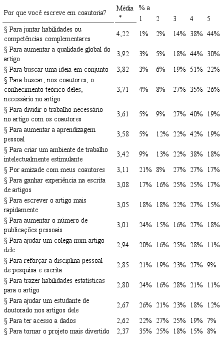 A literatura internacional aponta diversas motivações para a pesquisa em coautoria (Acedo et al., 2006; Barnett et al., 1988; Bidault e Hildebrand, 2014; Manton e English, 2006). Assim, questionamos os participantes quais as suas motivações para escrever em coautoria com o item “Por que você escreve em coautoria?”. Os pesquisadores brasileiros buscam as coautorias para aumentar a qualidade global do artigo (74%), juntar habilidades ou competências complementares (83%), estatísticas ou teóricas, e dividir o trabalho (59%) (Tabela 5). Estas são evidências da preocupação em melhorar a qualidade dos artigos, numa possível resposta à maior dificuldade de publicar em melhores periódicos e conseguir aumentar a produtividade. Também relevantes são as relações pessoais e de amizade (71%) na escolha dos coautores. Ou seja, a junção de habilidades e conhecimentos complementares é importante, mas também as afinidades e laços pessoais. No entanto, e apesar de buscarem complementaridade, a motivação de trazer habilidades estatísticas para o artigo surge menos significativa; possivelmente porque uma parte substancial das pesquisas realizadas no Brasil usa metodologias qualitativas, em contraste com as publicações internacionais (Phelan et al., 2002) onde predominam as publicações com metodologias quantitativas e estatísticas multivariadas.