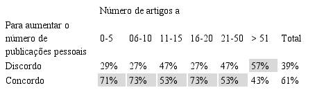 As coautorias são vistas como meio para aumentar a produção científica, mas mais marcadamente para os pesquisadores menos produtivos. Ou seja, os resultados mostram que quanto maior o número de publicações dos participantes, menos as coautorias parecem ser relevantes para efeitos de produtividade (Tabela 6). Os pesquisadores com mais publicações (51 ou mais) valorizam menos os benefícios das coautorias para aumentar a sua produção. Para estes, outros motivos regem as coautorias (como, por exemplo, para complementar as habilidades necessárias para o artigo), enquanto para os autores menos prolíficos, o foco parece estar em publicar mais.