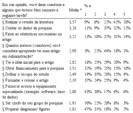 Quem é coautor num artigo ou que tarefas mínimas precisam ser realizadas para merecer coautoria? Perguntamos aos participantes sobre quais as tarefas necessárias para incluir alguém como coautor com a questão “Em sua opinião, você daria coautoria a alguém que tivesse feito somente a seguinte tarefa?”. Os resultados na Tabela 7 mostram que as funções de direção ou coordenação institucional não parecem merecer coautoria, mas várias outras tarefas que não envolvem uma contribuição intelectual também não. Por exemplo, não é suficiente preparar diagramas, formatar o artigo ou fornecer acesso a equipamento para merecer coautoria. Por outro lado, coletar dados, escrever a revisão da literatura ou fazer os tratamentos estatísticos necessários já são percepcionados como efetivamente contribuindo para o conteúdo do artigo e, assim, merecedores de coautoria. Estas evidências confirmam os resultados anteriores que as coautorias visam aumentar a qualidade do artigo, a divisão do trabalho e trazer habilidades e conhecimentos complementares.