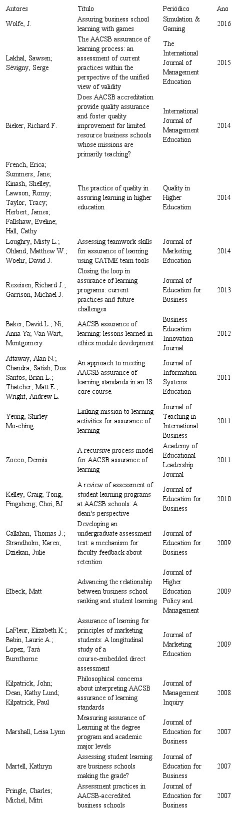 Para uma revisão inicial do tema, utilizou-se do descritor “AACSB” nas áreas de Negócios e Ciências Sociais Aplicadas, o que resultou em 166 artigos (164 na base de dados Scopus e 2 na base de dados Scielo) em sua realização no dia 3 de março de 2017. Unido ao descritor “Assur* AND Learning” como diferenciador, promoveu a pesquisa um universo de 56 artigos possíveis. Após uma etapa de classificação e ordenação pela leitura detalhada de resumos e títulos, organizados no software Mendeley, localizaram-se 18 artigos científicos respectivos ao tema abordado por esta pesquisa. Estes artigos propiciaram uma leitura apropriada sobre os procedimentos, resultados e aplicações do Assurance of Learning. Os artigos localizados são observáveis no Quadro 1.