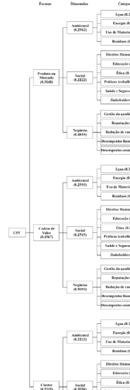 Com isso, a utilização do MAGIQ implicou na determinação da estrutura hierárquica do problema a partir da identificação dos elementos que possuem relacionamento direto com a geração de valor compartilhado. Logo, com base nos trabalhos de Abdalla (2015), Bowe e Horst (2015) e Porter et al. (2012), definiu-se que produto ou mercado, cadeia de valor e cluster estão vinculados diretamente com as ações de desenvolvimento de CSV. Em seguida, foi necessário identificar os respectivos subcritérios que formam cada um dos três critérios selecionados (produto ou mercado, cadeia de valor e cluster).