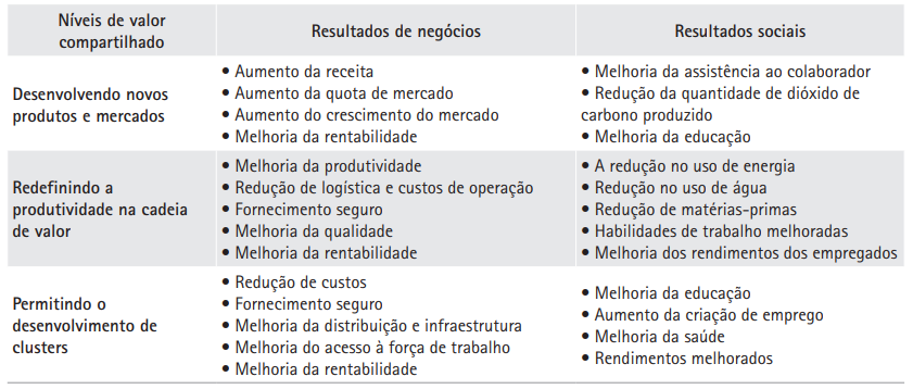 Para geração de valor econômico e social, Porter e Kramer (2011) propõem três níveis: desenvolvimento de novos produtos ou mercados; redefinição da produtividade na cadeia de valor e o desenvolvimento do cluster. Assim, as oportunidades de valor compartilhado vão depender do setor em que a empresa está inserida, da estratégia e dos problemas sociais (Porter et al., 2012).