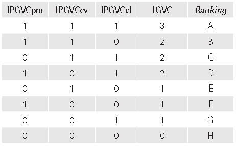 A classificação do IGVC, no entanto, foi obtida a partir de diferentes combinações entre os índices IGVCpm, IGVCcv e IGVCcl. Essa classificação a partir de combinações do desempenho em cada um dos índices segue a similar proposta aplicada por Barney e Hesterly (2007) no modelo VRIO. Barney e Hesterly (2007), no entanto, adotam os critérios “sim” e “não” na ferramenta de avaliação. Por exemplo, a empresa que respondeu sim nos quatro critérios do modelo (valor, raridade, imitabilidade e organização) é classificada como vantagem competitiva sustentável e força distintiva sustentável, enquanto que a empresa que respondeu sim em três critérios e não em imitabilidade é classificada como vantagem competitiva temporária e força distintiva. No modelo proposto nesta pesquisa, ao invés de sim e não a empresa irá aplicar uma nota de 1 a 5. Sendo assim, foi necessário estabelecer um critério que avaliasse a partir da nota apresentada pela empresa se ela tem ou não potencial de gerar vantagem competitiva por meio da geração de valor compartilhado. Para tanto, optou-se por adotar a média como critério de seleção.