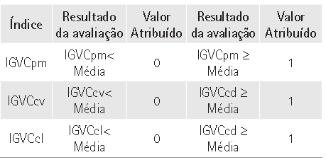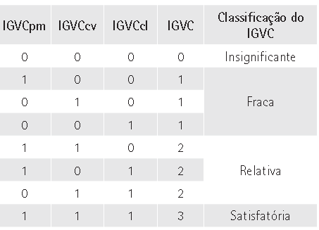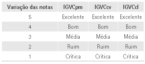 Para a classificação do IGVCpm, do IGVCcv e do IGVCcl foram propostos cinco intervalos de desempenhos: excelente; bom; médio; ruim; e crítico, conforme apresentado na Tabela 3.