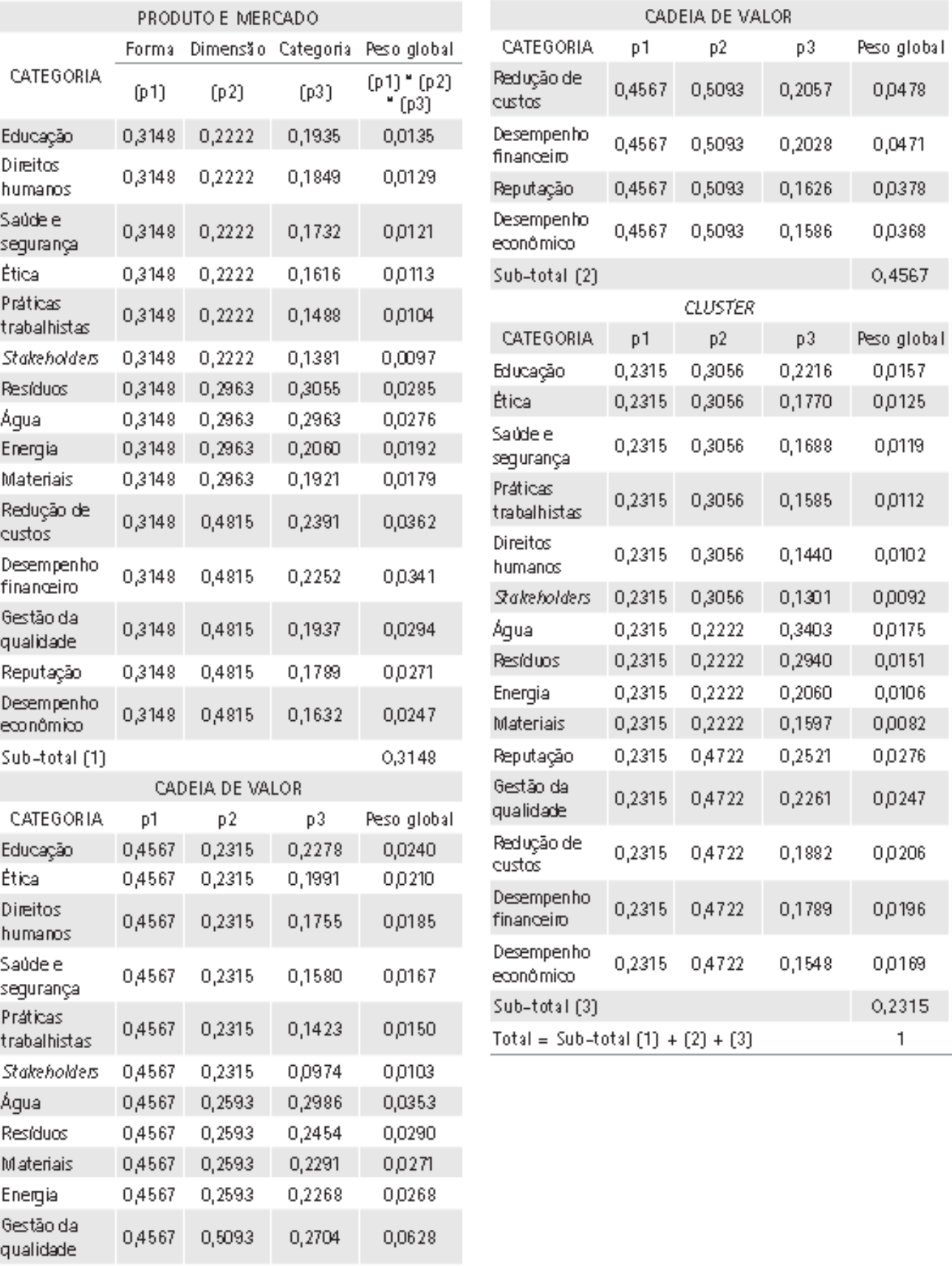 A Tabela 1 apresenta a determinação da estrutura hierárquica definida para esta proposta de mensuração da geração de valor compartilhado na indústria da construção civil. Como pode ser visto, cada critério (produto ou mercado, cadeia de valor e cluster) é formado pelo mesmo conjunto de subcritérios (dimensões e categorias). Vale ressaltar que essas dimensões (ambiental, social e negócios) foram selecionadas a partir das orientações de Porter de Kramer, conforme Quadro 1. As categorias por sua vez representam as questões que mais impactam o setor da construção civil e seu processo de seleção é descrito a seguir.