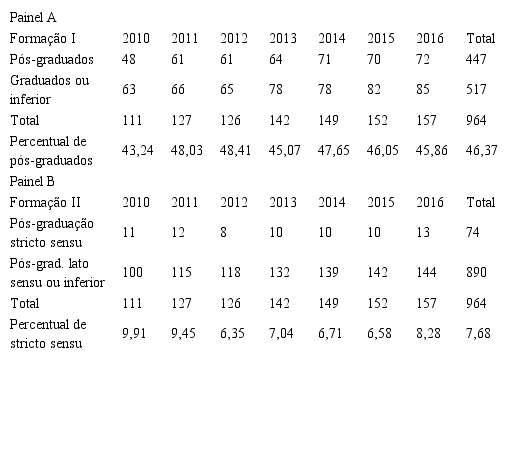 Ao comparar os pós-graduados do Painel A com os pós-graduados stricto sensu do Painel B, da Tabela 7, verifica-se que o número de pós-graduados que possuem mestrado, doutorado ou pós-doutorado é pequeno se comparado com especializações, MBA dentre outros.