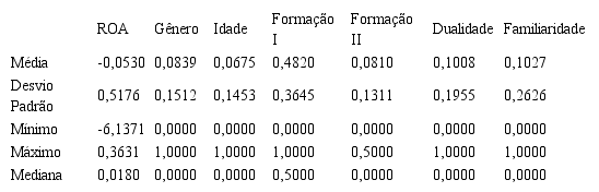 Para a variável gênero, atribuiu-se o percentual da participação feminina na diretoria por ano. Em relação à dualidade, caso o diretor pertença à diretoria e ao conselho de administração, elencou-se a proporção dos cargos acumulados simultaneamente. Quanto à familiaridade, trata-se da existência de parentesco com outro membro da diretoria ou do conselho de administração, apropriou-se o percentual da existência.