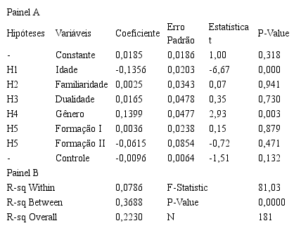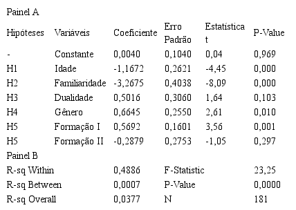 As variáveis dualidade (H3) e formação II (H5) não foram estatisticamente significativas ao intervalo de 0,01 de confiança. Destaca-se que foram realizados novos testes estatísticos, sem essas duas variáveis, e constataram-se pequenas mudanças no poder explicativo do modelo como um todo.