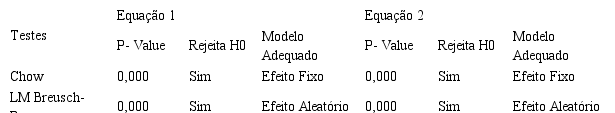 Realizou-se, primeiramente, os testes F de Chow, Langrang multiplier de Breush-Pagan e o teste de Hausman para verificar qual modelo estimado seria mais apropriado para os dados. Conforme Tabela 1, para a Equação 1, o teste de Chow resultou em efeito fixo, já o LM de Breush-Pagan efeito aleatório, e por fim, o teste de Hausman resultou em efeito fixo, sendo, portanto este o modelo estimado da pesquisa. Já para a Equação 2, os testes apontaram o modelo adequado de efeito aleatório.