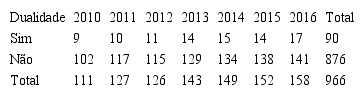 Em relação à dualidade, no total, 90 pessoas ocupam um cargo tanto na diretoria como no conselho de administração, conforme a Tabela 3. Pode-se observar também que no decorrer dos anos o número de dualidades aumentou, com 9 observações em 2010 e 17 em 2016.