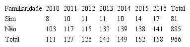 A familiaridade pode ser observada na Tabela 4. Dos 966 diretores, 81 possuem parentescos com outras pessoas que ocupam tanto cargo de direção como do conselho administrativo e fiscal. Ressalta-se que foi observado apenas se o diretor possui familiaridade com algum membro de alto escalão, não categorizando possíveis empresas familiares. Observa-se ainda que a familiaridade não foi constante, isso pode ser acarretado pela mudança dos cargos de alto escalão devido ao fim de mandato.