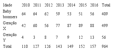 Em relação à idade, foi feita a classificação de executivos jovens com base nas gerações, que conforme Veloso, Dutra e Nakata (2016) pessoas nascidas até 1964 são da geração baby boomers, nascidos entre 1965 a 1977, denominados Geração X, e de 1978 a 1999, designado Geração Y. A proporção dessa variável foi em relação à quantidade de diretores que pertencem à geração Y.
