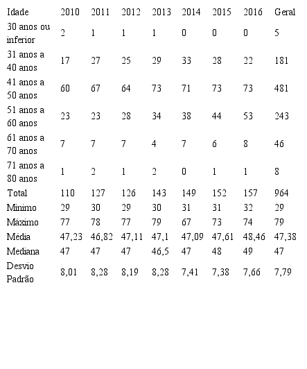 A Tabela 6 mostra a idade dos diretores por ano e total, além da média, mediana, máximo e mínimo. Observa-se que a concentração de diretores está entre 41 a 50 anos, com aproximadamente metade da amostra (481 de 964). Apenas em 2014 a idade máxima foi inferior a 70 anos, enquanto a idade mínima se manteve próxima aos 30 anos. A média, desvio padrão e mediana também se mantiveram constantes ao longo dos sete anos, ficando próximas do geral.